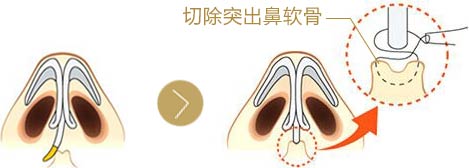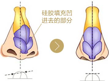 采取切除突出部分,利用硅胶填充凹进去的部分,使鼻子变的笔直。